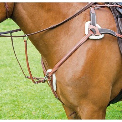 Een fantastisch uitziende vijfpuntige borstplaat met zacht leer beklede vulling, verwijderbare schapenvacht pads en elastische inzetstukken om het paard zo comfortabel mogelijk te maken. Onderscheidend stiksel details, plantaardig gelooid leer, afneembare hardloop Martingale bevestiging en roestvrij stalen fittingen. Vervanging schapenvacht pads afzonderlijk verkrijgbaar. Leer van Avignon is plantaardig gelooid voor een soepele, aantrekkelijke finis