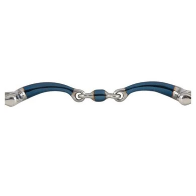 Deze dubbel gebroken D-ringtrens is vervaardigd van massief roestvrij staal gecombineerd met een sweet iron laagje op het mondstuk (blauw). De sweet iron coating op het mondstuk stimuleert de aanmaak van speeksel. Wanneer dit materiaal reageert met vocht, warmte en lucht zal het oxideren en een zoet smakende oppervlakteroest ontwikkelen. Dit helpt bij de acceptatie van het bit. Uiteindelijk verdwijnt de blauwe kleur, maar de smaak van het oppervlakteroest blijft.