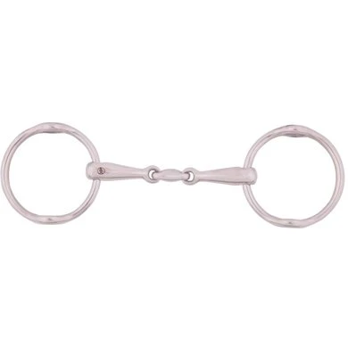 Dubbel gebroken, massief roestvrij staal, ringen 75 mm. Het mondstuk heeft een dikte van 18 mm.