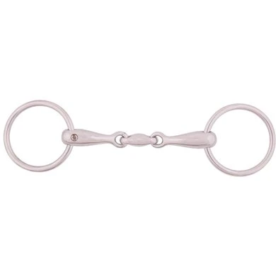 Dubbel gebroken, massief roestvrij staal, ringen 55 mm bij 11.5 cm en 65 mm bij de andere maten. Het mondstuk heeft een dikte van 16 mm.