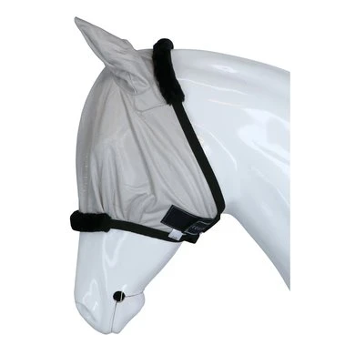 Vliegenmasker van polyester mesh 120 g, volledig afgewerkt met zwart syntetisch schapenvacht.