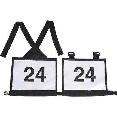 Van waterproof polyester, met twee-zijdig transparante pvc zakken voor het nummer. Sluit met polypropylene riemen en elastische riem met clip. Voor cross country, trek or endurance wedstrijden