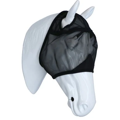 Vliegenmasker met coupenaden bij de ogen. Stevig materiaal, rondom met fleece afgebiesd. Afgezet met elastiek, zodat het masker perfect aansluit op het paardenhoofd en tegelijkertijd comfortabel zit. Klittenbandsluiting bij de keel. Extra fleece boven de ogen ter bescherming van de ogen en voor meer comfort.