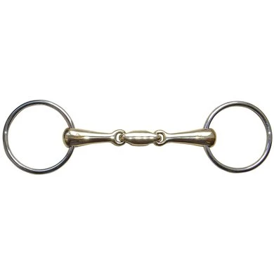 watertrens dubbel gebroken met ovaal tussenstuk en 20mm dik GB mondstuk, SS rings 65mm Koperkleurig, mondstuk. Samenstelling van 86%-90% koper, 8%-12% aluminium en 3% ijzer Deze samenstelling zorgt ervoor dat het paard wat makkelijker kauwt en onspant op het bit.