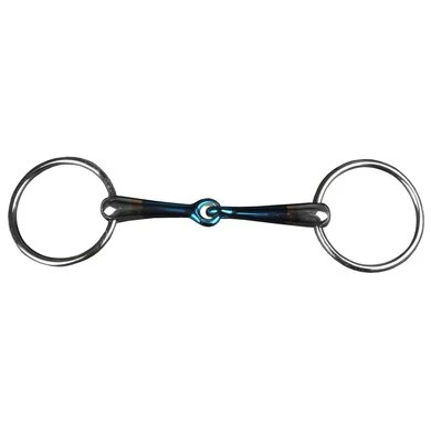 De blauwe kleur van het bit verandert geleidelijk naar grijs/bruin met de roestplekjes zichtbaar op het mondstuk.