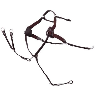 Vijfpunts lederen voortuig met elastiek. Het voortuig heeft een verstelbare singellus met gespsluiting en is voorzien van een afneembare, verstelbare martingaalvork. Het martingaalgedeelte is zacht gevoerd. Het voortuig heeft van de schouder naar de schoft en van de schouder naar het zweetblad elastische riemen voor extra comfort en bewegingsvrijheid. Het voortuig wordt met verstelbare lederen riemen met gespsluiting bevestigd aan de singelstoten. Tevens heeft het voortuig verstelbare lederen riemen met musketons, voor bevestiging aan de D-ringen aan de voorzijde van het zadel. De driehoekige schouderkussens zorgen voor extra comfort. Het voortuig is voorzien van roestvrijstalen fournituren. Een voortuig wordt gebruikt om het zadel een stabiele ligging te geven. Dit voortuig is zeer geschikt voor eventing en springen.