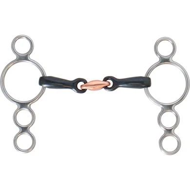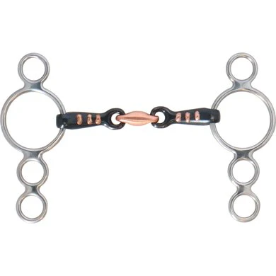 Dit pessoa bit bevordert de speekselaanmaak en produceert een aangename smaak in de mond van het paard. Opstaande koperen ribben helpen voorkomen dat het paard te veel grip krijgt/ De 5 en kleinere maten hebben kleinere ringen om ervoor te zorgen dat het bit in verhouding blijft met het kleinere hoofd.
