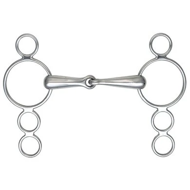 Deze roestvrijstalen bit is handig wanneer controle een probleem is – de drie ringen bieden hefboomopties om de ernst te vergroten. De 5 en kleinere maten van dit bit worden geleverd met kortere wangen om ervoor te zorgen dat het bit in verhouding blijft.