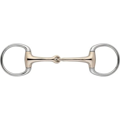 Enkelgebroken bustrens. 16mm dik. 12,5cm breed. Materiaal Sensogan met RVS ringen. Stimuleert de speekselaanmaak, de kauwactiviteit en daarmee de aanname van het bit.