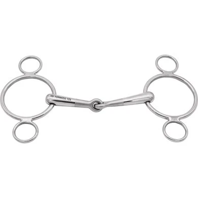 Enkelgebroken Turnado 3-ring trens. 16mm dik. 11,5cm breed. Materiaal RVS met RVS ringen. Het innovatieve middenstuk van de Turnado trens is 45 graden naar voren gedraaid en gelijk aan beide zijden. Dit maakt een gelijke druk over de tongranden mogelijk en krijgt deze trens nooit het ‘notenkraker effect’ in het gehemelte. Vriendelijk voor de tong. Het middenstuk van het mondstuk is licht gezandstraald zodat deze trens direct opvalt tussen de reguliere enkelgebroken trenzen. Dit heeft geen functie en verdwijnt geleidelijk gedurende het gebruik. Verschillende mogelijkheden om de teugels te bevestigen waardoor de hefboomwerking achter de oren bepaald kan worden.