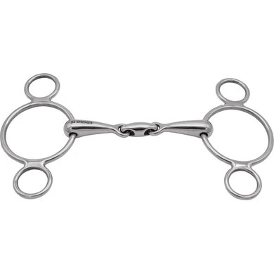 Enkelgebroken 3-ring bit. 16mm dik. 11,5cm breed. Materiaal RVS. Dit bit is ook wel bekend als het pessoa bit. Veelzijdig inzetbaar door de verschillende manieren waarop de teugels bevestigd kunnen worden. De werking van het bit is afhankelijk van de bevestiging van de teugels. Bij gebruik van een kinriem wordt de hefboomwerking achter de oren beperkt en de druk op de onderkaak versterkt. Geschikt voor paarden die sterk worden in het parcours.
