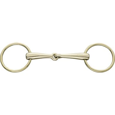 Enkelgebroken watertrens. 18mm dik. 12,5cm breed. Materiaal Sensogan met Aurigan ringen. Stimuleert de speekselaanmaak, de kauwactiviteit en daarmee de aanname van het bit.