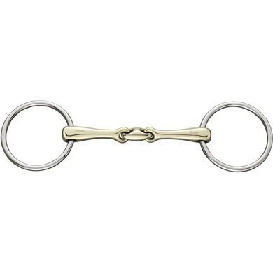 ‘Dubbelgebroken KK Ultra watertrens. 18mm dik. 12cm breed. Materiaal Sensogan met RVS ringen. Stimuleert de speekselaanmaak, de kauwactiviteit en daarmee de aanname van het bit. Het middenstuk is 45 graden gekanteld, waardoor het bit optimaal op de tong komt te liggen. Voor optimale verfijning en verbetering van de aanleuning.