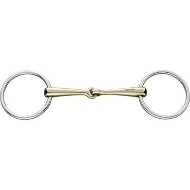 Enkelgebroken watertrens. 14mm dik. 12,5cm breed. Materiaal Sensogan met RVS ringen. Stimuleert de speekselaanmaak, de kauwactiviteit en daarmee de aanname van het bit.