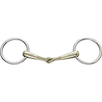 Enkelgebroken Turnado watertrens. 18mm dik. 12,5cm breed. Materiaal Sensogan met RVS ringen. Het innovatieve middenstuk van de Turnado trens is 45 graden naar voren gedraaid en gelijk aan beide zijden. Dit maakt een gelijke druk over de tongranden mogelijk en krijgt deze trens nooit het ‘notenkraker effect’ in het gehemelte. Vriendelijk voor de tong. Het middenstuk van het mondstuk is licht gezandstraald zodat deze trens direct opvalt tussen de reguliere enkelgebroken trenzen. Dit heeft geen functie en verdwijnt geleidelijk gedurende het gebruik.