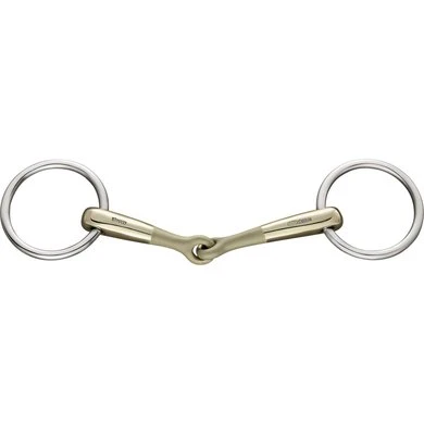 Enkelgebroken Turnado onderleg watertrens. 14mm dik. 10,5cm breed. Materiaal Sensogan met RVS ringen. Het innovatieve middenstuk van de Turnado trens is 45 graden naar voren gedraaid en gelijk aan beide zijden. Dit maakt een gelijke druk over de tongranden mogelijk en krijgt deze trens nooit het ‘notenkraker effect’ in het gehemelte. Vriendelijk voor de tong. Het middenstuk van het mondstuk is licht gezandstraald zodat deze trens direct opvalt tussen de reguliere enkelgebroken trenzen. Dit heeft geen functie en verdwijnt geleidelijk gedurende het gebruik.