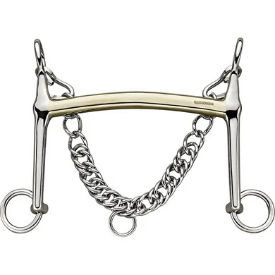 Dressuurstang “French”. 14mm dik. 12,5cm breed. Materiaal Sensogan met RVS scharen. Rechte stang met lichte tongboog. Drukt niet in het gehemelte. Evenredige druk op de tong en de onderkaak. Geschikt voor paarden met weinig ruimte in de mond. Scharen 7cm. Heeft een grote, maar vertraagde inwerking achter de oren door de lange scharen.