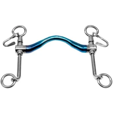 Een baby dressuur-pompstang wordt samen met een onderlegtrens gebruikt, de zogenaamde stang en trens. Deze combinatie wordt gebruikt in de hogere dressuur klassen. Door de pompfunctie zit er meer beweging in het bit. Het paard kan naar behoefte het bit iets oplichten om de druk op de tong te verminderen. De dressuurstang is een kaakstuk met hefboomwerking. Hoe langer de scharen hoe scherper de inwerking. De baby pomp-dressuurstang heeft korte scharen en heeft daarom een mildere inwerking dan de normale pomp-dressuurstang. Voor een stang en trens combinatie is een speciaal stang en trens hoofdstel vereist of een extra bakstuk. Daarnaast moet dit kaakstuk altijd gecombineerd worden met een kinketting om te voorkomen dat het bit doorslaat. Dit bit is niet geschikt voor de onervaren ruiter Dit mondstuk is een stang met een medium tongboog. De tongboog zorgt voor meer tongvrijheid waardoor er geen druk op de tong komt maar verdeeld wordt over de lagen. Dit maakt het bit ideaal voor paarden met een gevoelige tong of paarden die de tong uitsteken. De Sweet Iron bitten zijn gemaakt van staal en hebben een herkenbare blauwe kleur. Sweet Iron ontwikkelt door contact met (lucht)vochtigheid oppervlakteroest die zoet smaakt en op een natuurlijke manier de speekselaanmaak van het paard stimuleert. Hierdoor zal het paard meer gaan schuimen, wat zorgt voor een betere acceptatie van het bit. Dit roestproces (oxidatie) verandert de blauwe kleur van de TRUST-bitten in bruingrijs. Dit is een gewenst effect van de Sweet Iron bitten. Bij het tijdelijk niet gebruiken van een Sweet Iron bit kan zich een oranjebruin roestlaagje op het mondstuk vormen. Dit kan eenvoudig worden verwijderd door het bit af te nemen met een vochtige doek.